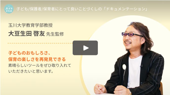 コドモンの保育ドキュメンテーションは、玉川大学教育学部教授の大豆生田 啓友先生の監修の元、難しい知識がなくても保育ドキュメンテーションを実践でき、質の高い記録・振り返り・計画ができるよう設計しています。