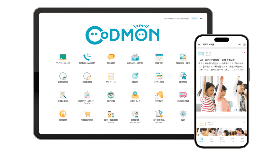 コドモンでは、登降園・入退室管理や指導計画・日誌の作成、効率的な保護者連絡など、