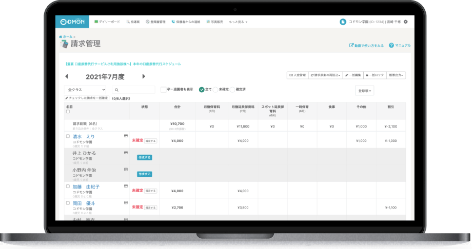 認定こども園への移行によって、1号・2号・3号認定が園に混在した場合でも、保育料・延長保育料設定を園児別に切り分けて請求額を自動算出することができます。
