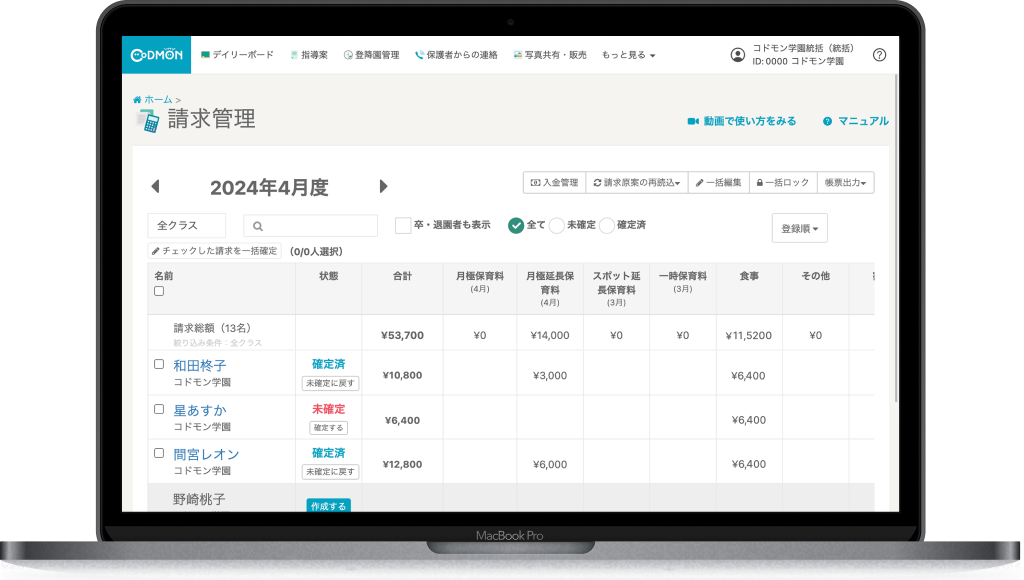 あらかじめ設定された保育料や、登降園時刻から算出された延長保育料などを元に毎月の請求を自動作成。園児 / 児童ごとに異なる設定の複雑な請求や施設独自の延長保育設定の自動計算にも対応しています。