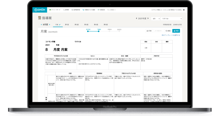 コドモンは、申請と同時にその場ですぐにアドバイスや修正ができるのはいいですよね。私自身も職員のことをしっかり見られるようになったのがすごくよかったです。職員も、すぐに見てもらい承認してもらえるようになって、やりとりが早くなりました。