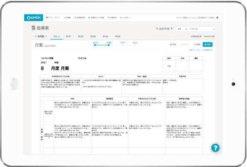 作成の際はいくつか文例があってその中から選ぶのですが、選んでいく中で「この月齢の子どもはこんな姿が見られるんだな」と保育の参考にもなっています。作成しながら同時に3人で情報共有ができて、そのまま完成ということもあるので作業負担は減っていますし、作成した月案や週案を使って意見を交わしたり修正したりすることで研修にもなっています。