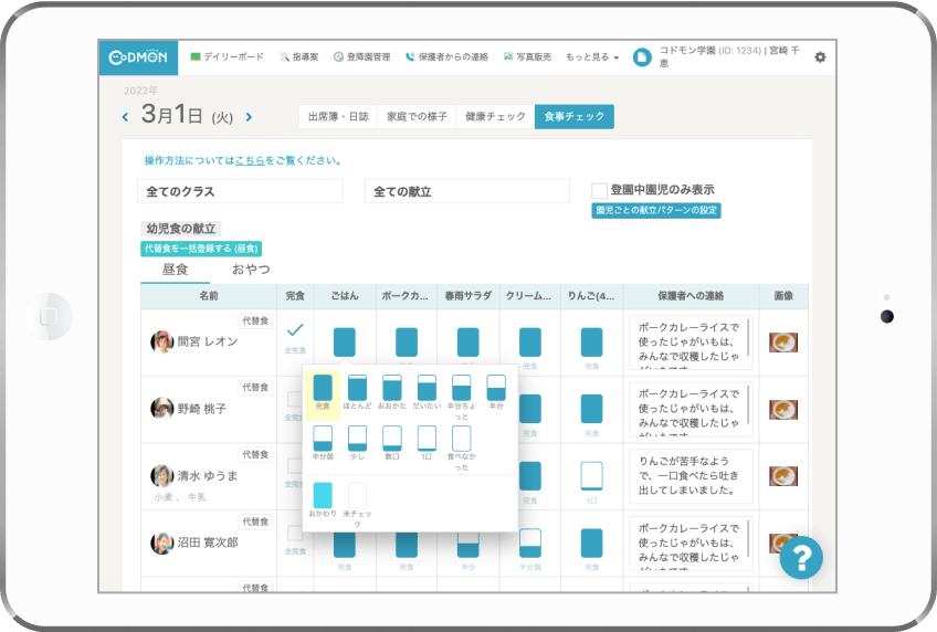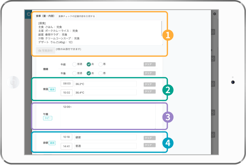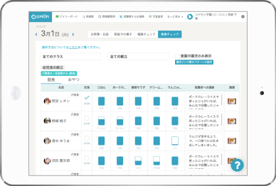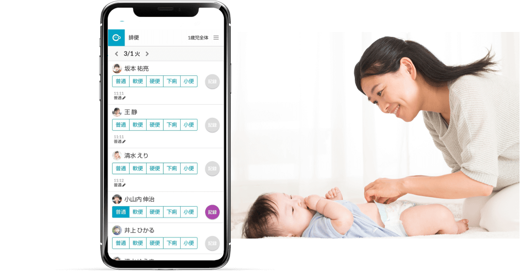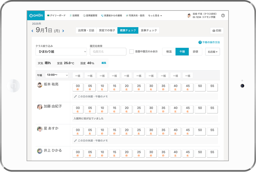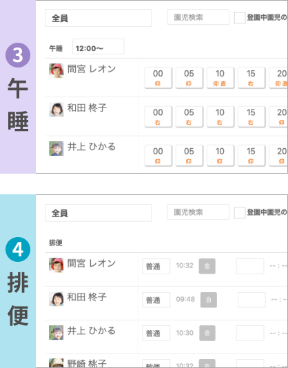 日々の園児別の健康記録(午睡・検温・排便・食事)をタブレットやスマートフォンで