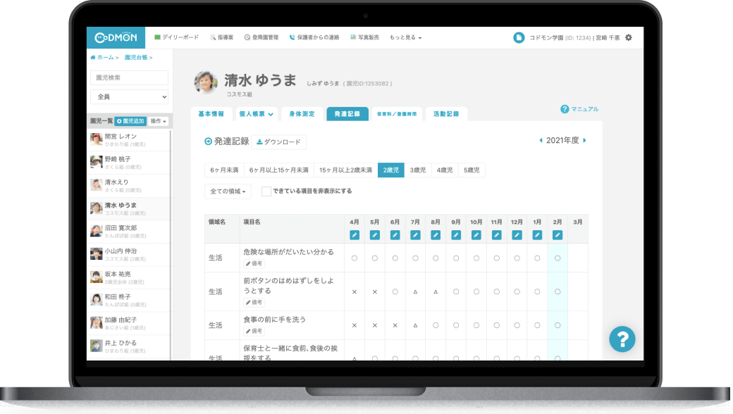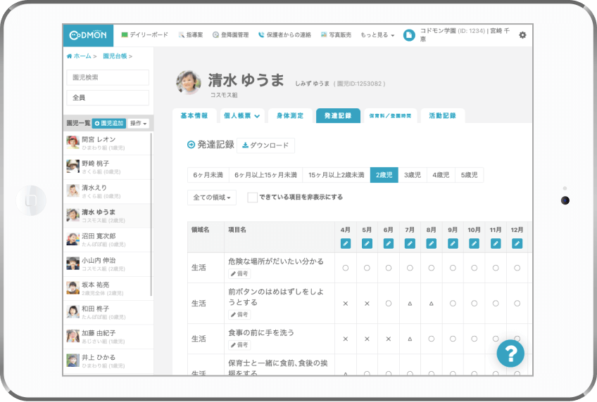 園児一人ひとりの年齢や発達状態に合わせてチェック形式で記録する機能です。