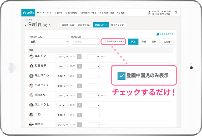 園児の体調変化や検温の管理を強化する目的で、ICTでの管理を始めてみたものの、以前のシステムでは園児の体温のデータが一覧で見られず、一人ずつ連絡帳を開かないと確認できなかったんです。 先生たちは子どもたちが発熱していないかを確認するだけでも大変な作業量になってしまい、どうにかしてほしいという現場の声が大きくなっていました。