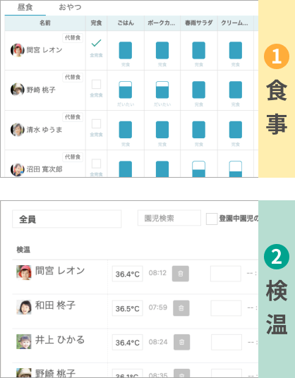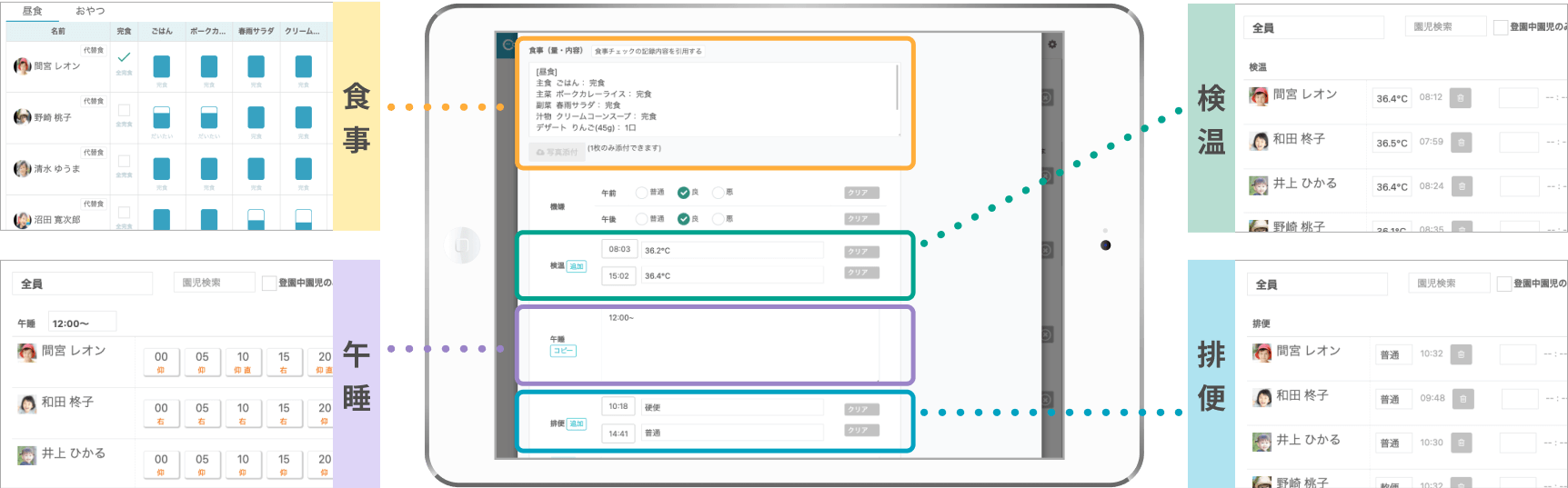 食事・検温・午睡・排便などの各種記録は、園児 / 児童ごとの連絡帳に自動転記されます。