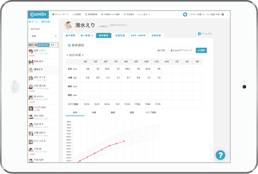 自動でグラフが作成されて、園児の発達・成長が一目でわかります。