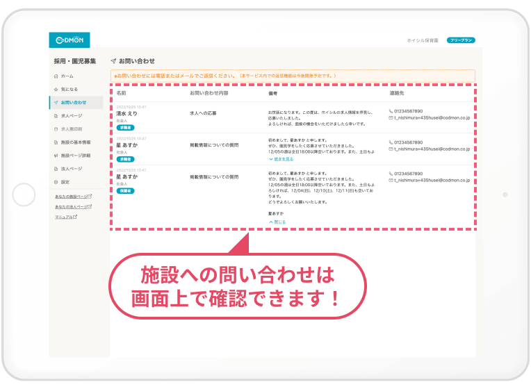 保護者や求職者によっては電話よりフォームからのほうが気軽に行えることもあり、問い合わせアップにつながる可能性が高まります。ページをしっかり見たうえでの問い合わせも多く、施設にとっては理念に共感していただくきっかけになります。