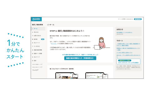 施設の魅力を伝えられる専用のホームページを簡単に無料※2で作成できるサービスです。地域の保護者や求職者に施設の取り組みをわかりやすくPRできる他、園見学の申し込みや求人の問い合わせをオンライン上で受け付けることができ、すでにホームページをお持ちの施設でも活用が広がっています。