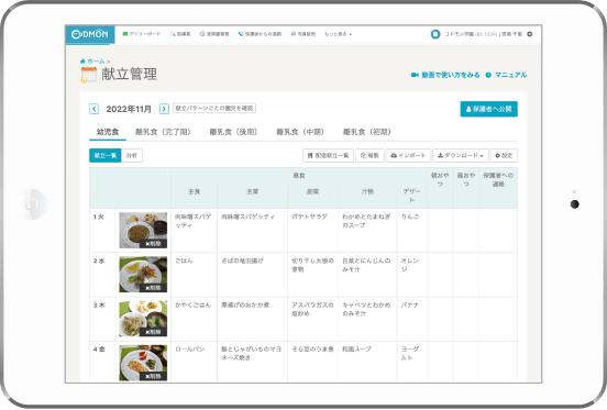 園児台帳・登降園などの保育情報と連携した献立作成や、保護者アプリを使った献立配信などで、