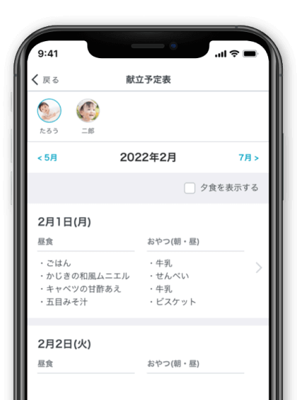 アプリで献立表を配信するだけではなく、成長段階により個別に最適化された献立表を自動的に配信。