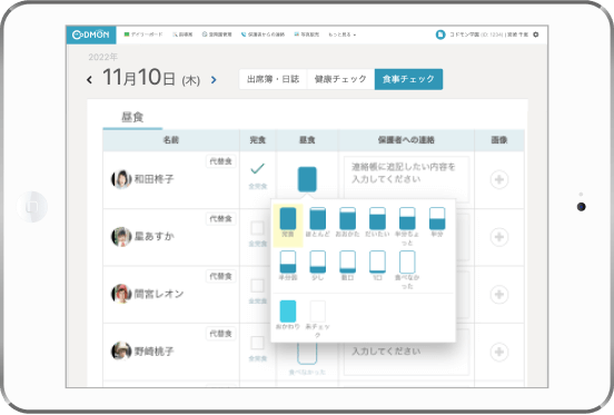 連絡帳に記載された睡眠や病気、家庭内の食事状況を確認することで、食育計画の立案や個別対応に役立てることができます。