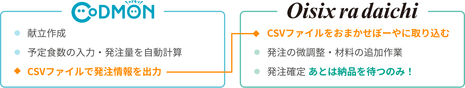 給食管理で作成した献立情報をもとに発注情報をCSVファイルで出力することができます。