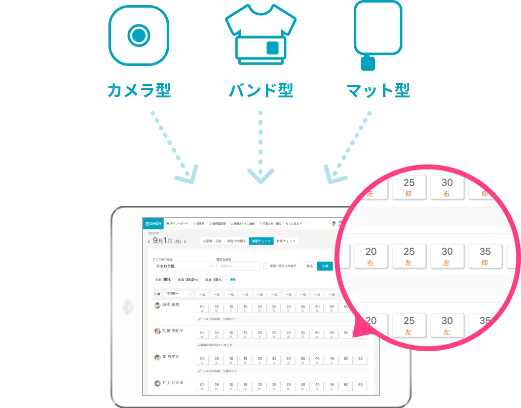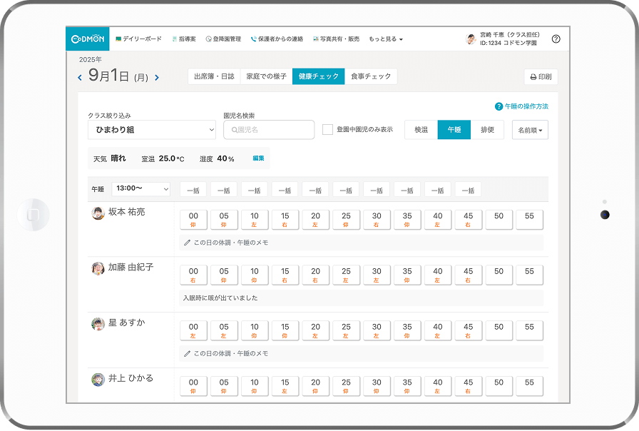 何度もチェックが必要な午睡時間の作業も大幅に省力化できます。